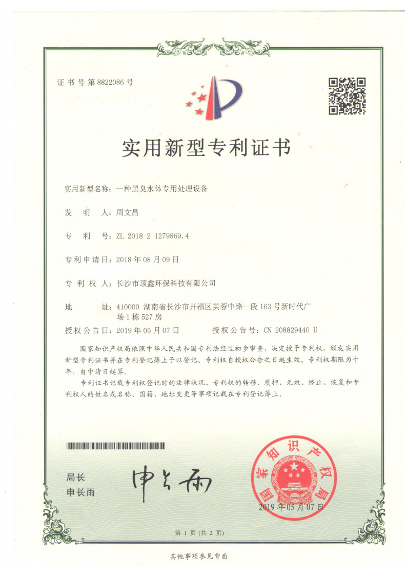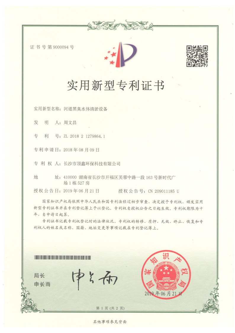 一种便携式无害化农村污水处理装置_实用新型专利证书
